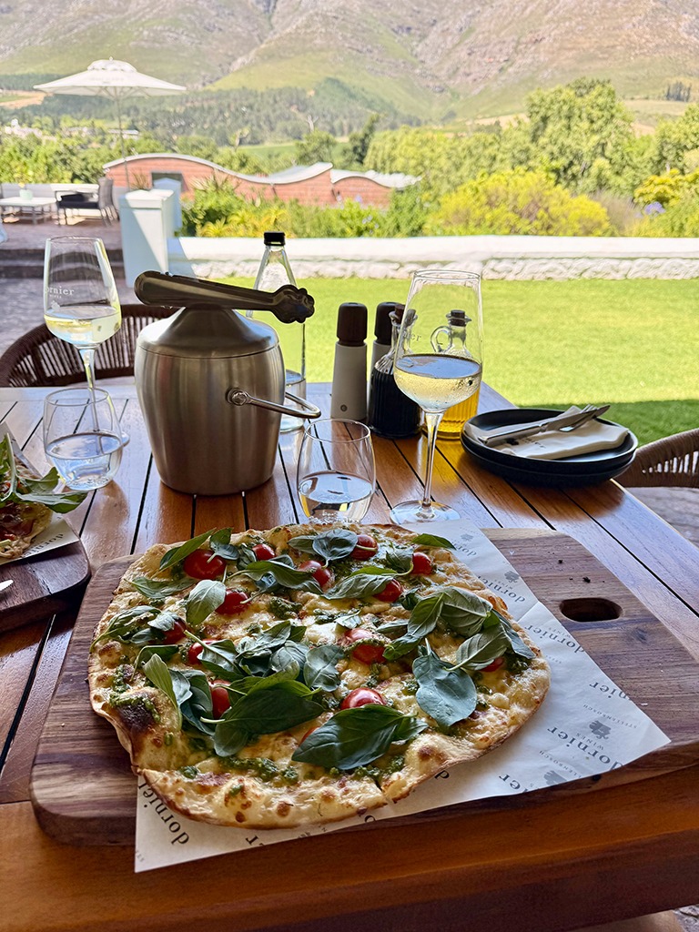 Dornier gehörte einem dem deutschen Urenkel der gleichnamigen Flugzeugherstellers. Heute ist es ein kleines, schickes und exklusives Weingut, mit einer überscihtlichen Karte und hervorragendem Wein. Perfekt zum Mittagessen. Die Flammkuchn sind exzellent. Direkt nebenan liegt das ebenfalls sehr schöne Waterford Estate welches mit einer beeindruckenden Auffahrt punktet.